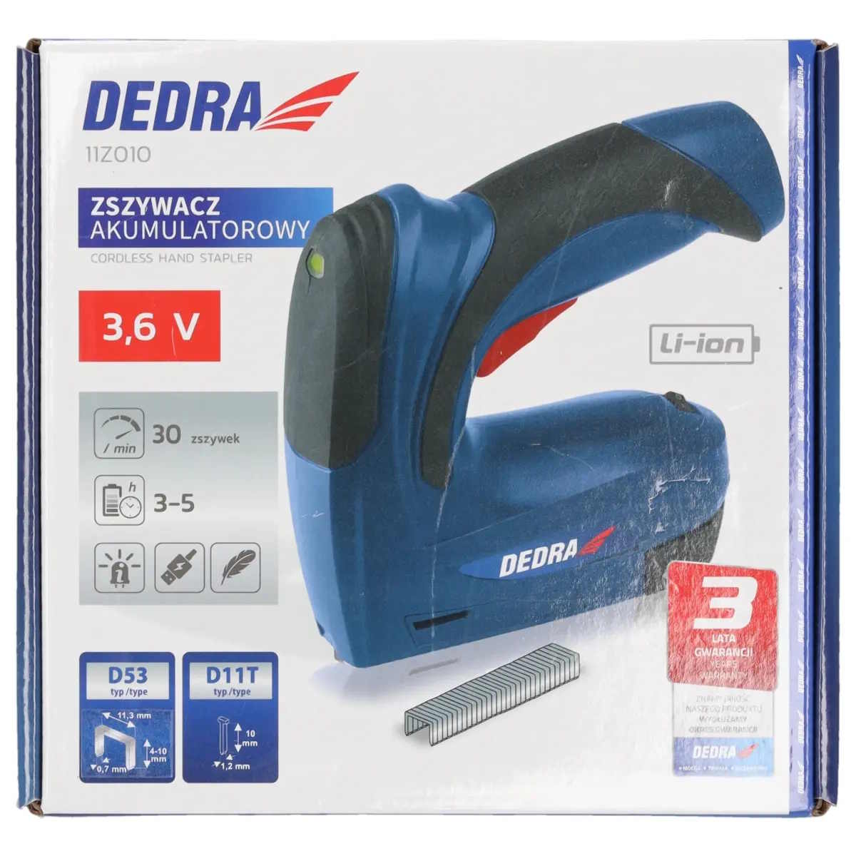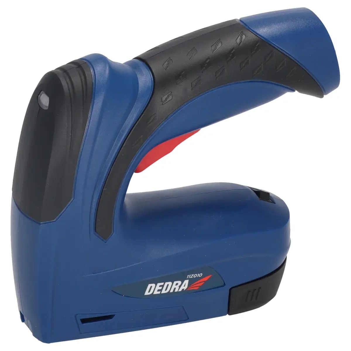 DEDRA 11Z010 bežična klamerica za presvlake praktičan je alat za sve koji se bave tapeciranjem, obradom presvlaka, montažom tkanina, folija ili tankih materijala. Zahvaljujući baterijskom napajanju, omogućuje potpunu slobodu kretanja i rad bez produžnih kabela, što je posebno korisno u radionici, na terenu ili u kućnim uvjetima. Puni se putem priloženog USB kabela bilokojim punjačem (punjač nije u opsegu isporuke)