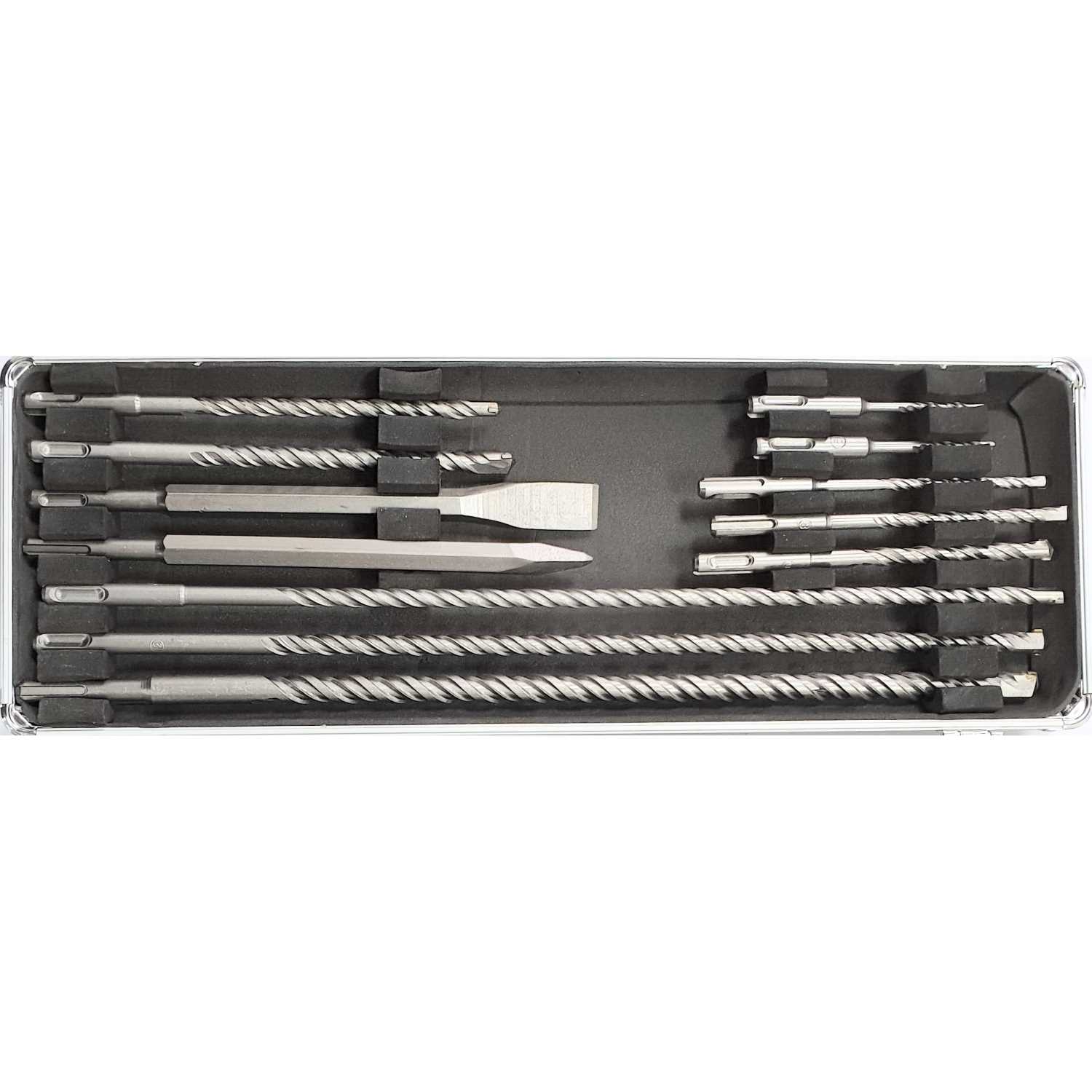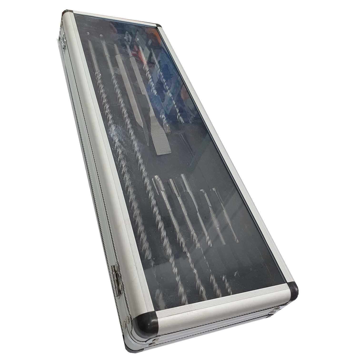 Kompletna garnitura SDS garnitura za bušenje i razbijanje betona, opeke, keramike. Sadrži 12 komada pribora, 10 SDS svrdala, šipicu i dlijeto, sve u praktičnom aluminijskom koferu za uredno odlaganje pribora.
