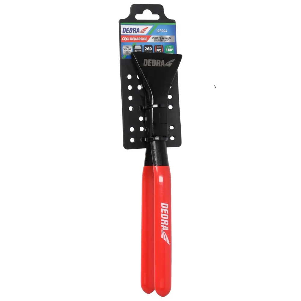 DEDRA 12P004 krovopokrivačka ravna kliješta za lim izrađena su od izdržljivog ugljičnog čelika koji osigurava visoku otpornost na trošenje, udarce i deformacije, čime se produžuje vijek trajanja alata. Namijenjena su ručnom oblikovanju lima, savijanju rubova i preciznom formiranju površina, što ih čini neizostavnim alatom u limarskim i krovopokrivačkim radovima.