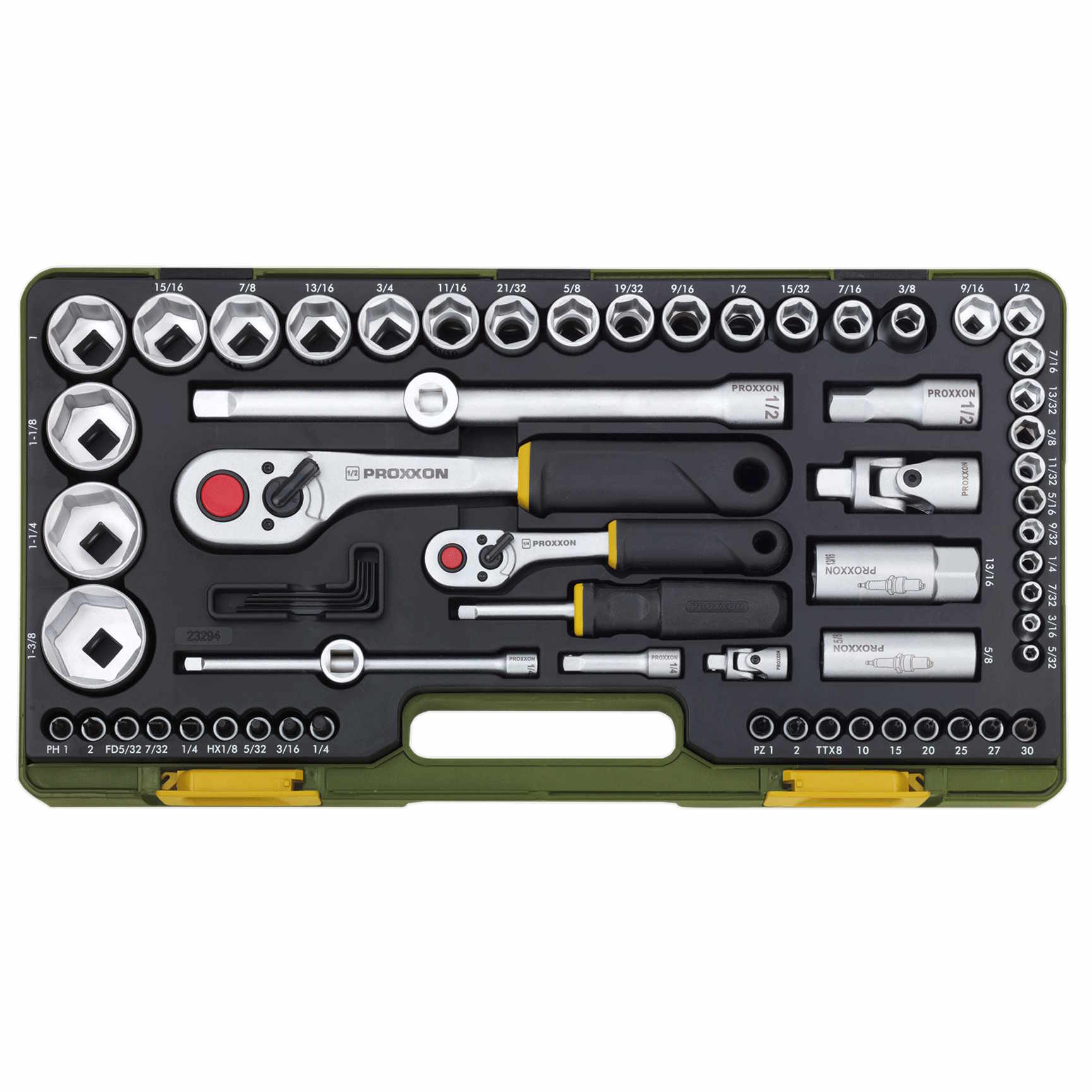PROXXON Industrial komplet nasadnih ključeva u inčima – 65 dijelova (NO 23 294) Px23294. Raspon od 5/32″ do 1 3/8″, dvije račne 1/4″ i 1/2″ sa 72 zuba i Quick-Release otpuštanjem, svjećice 5/8″ i 13/16″, nastavci za ravne, križne (Phillips), TX s rupom i imbus vijke, produžeci, zglobovi te kutni imbus ključevi. Izrađeno od CrV čelika; kvaliteta nadmašuje DIN/ISO. Isporučuje se u čvrstoj plastičnoj kutiji.