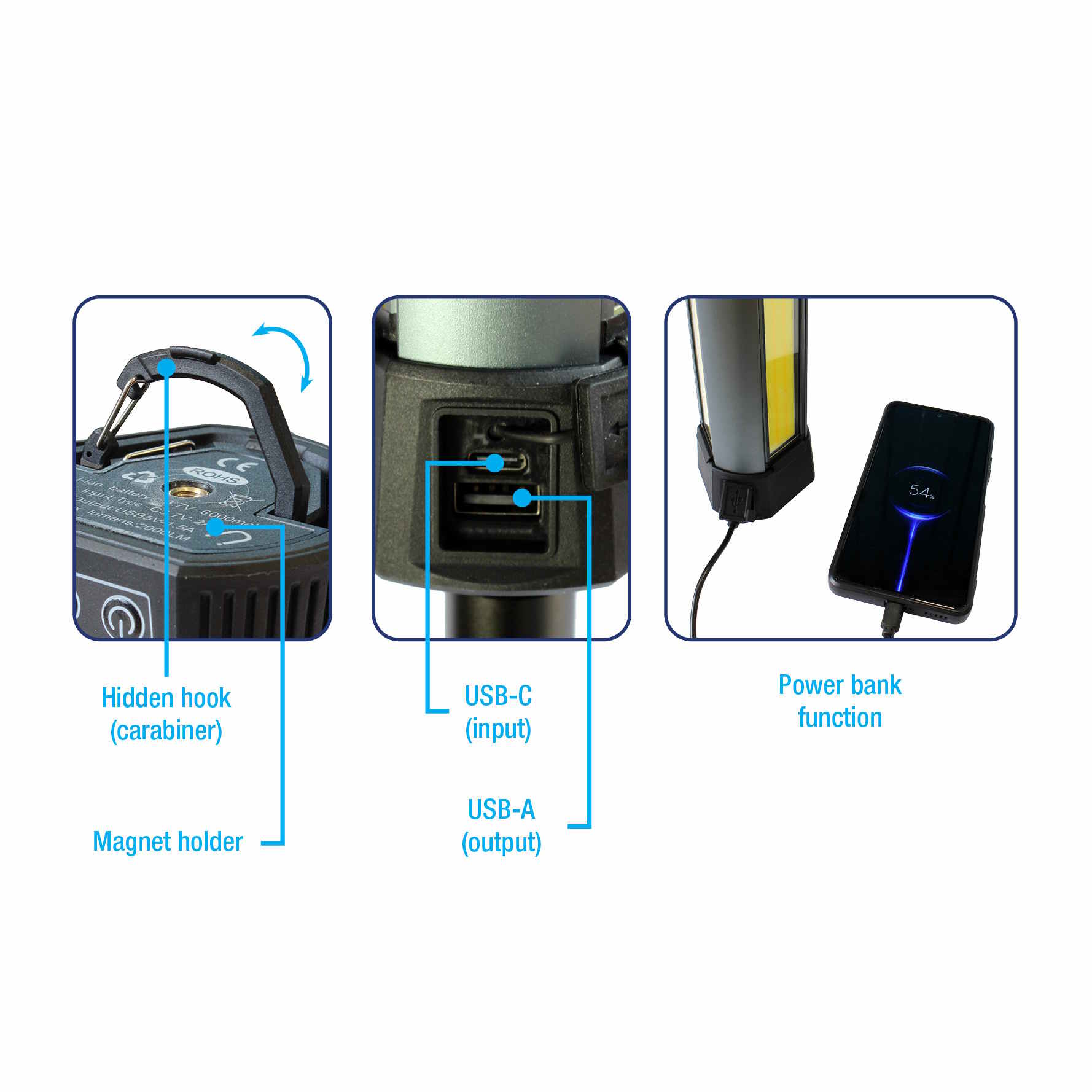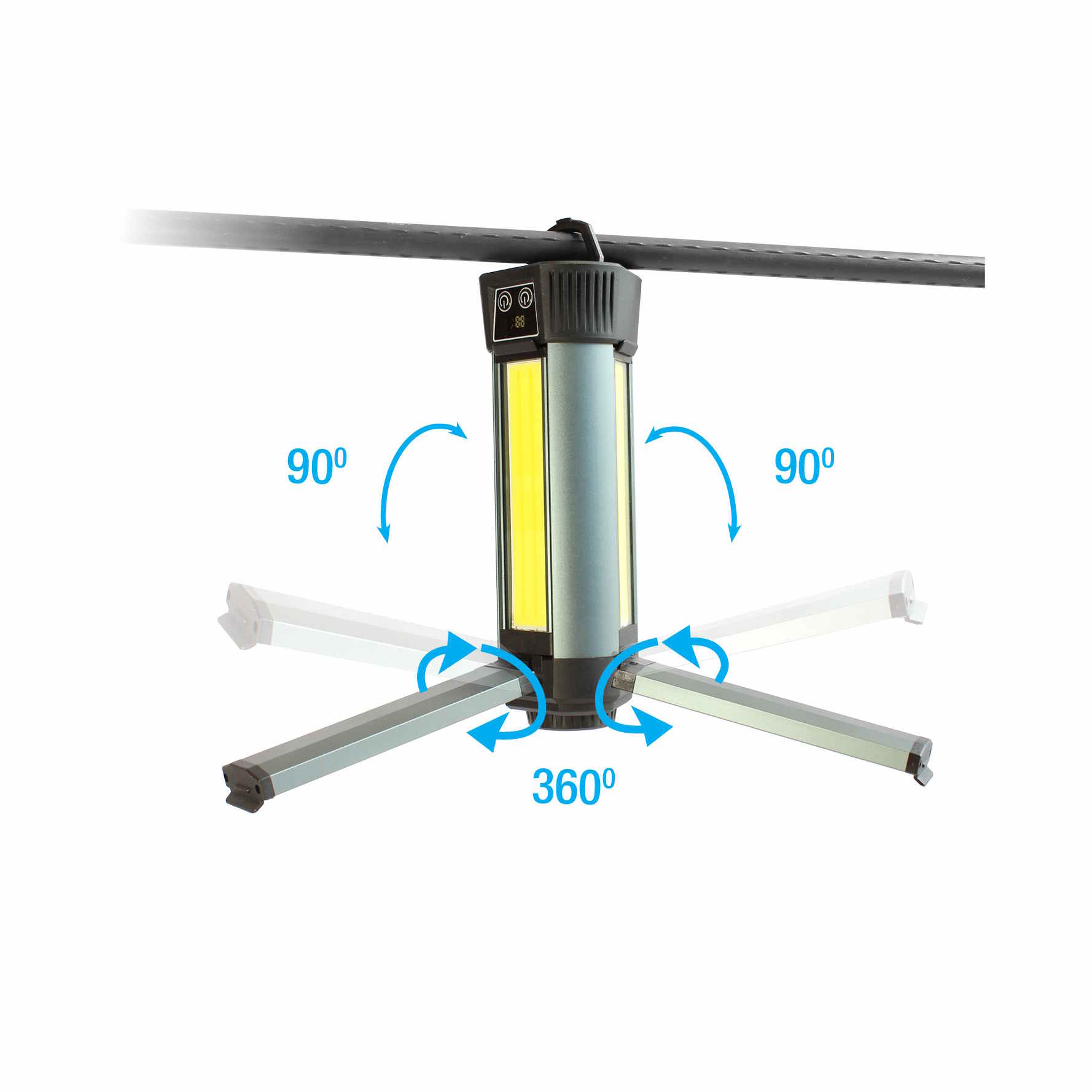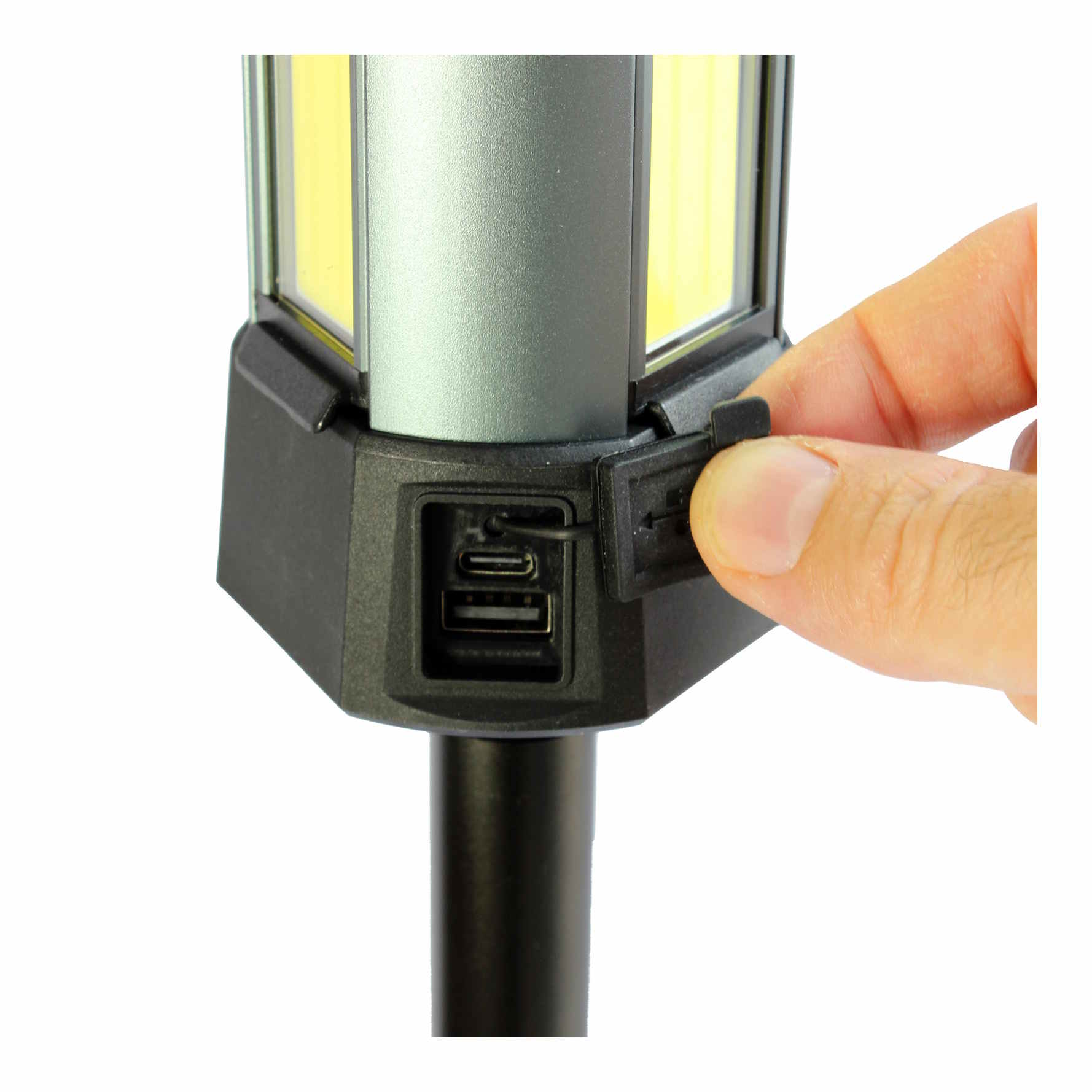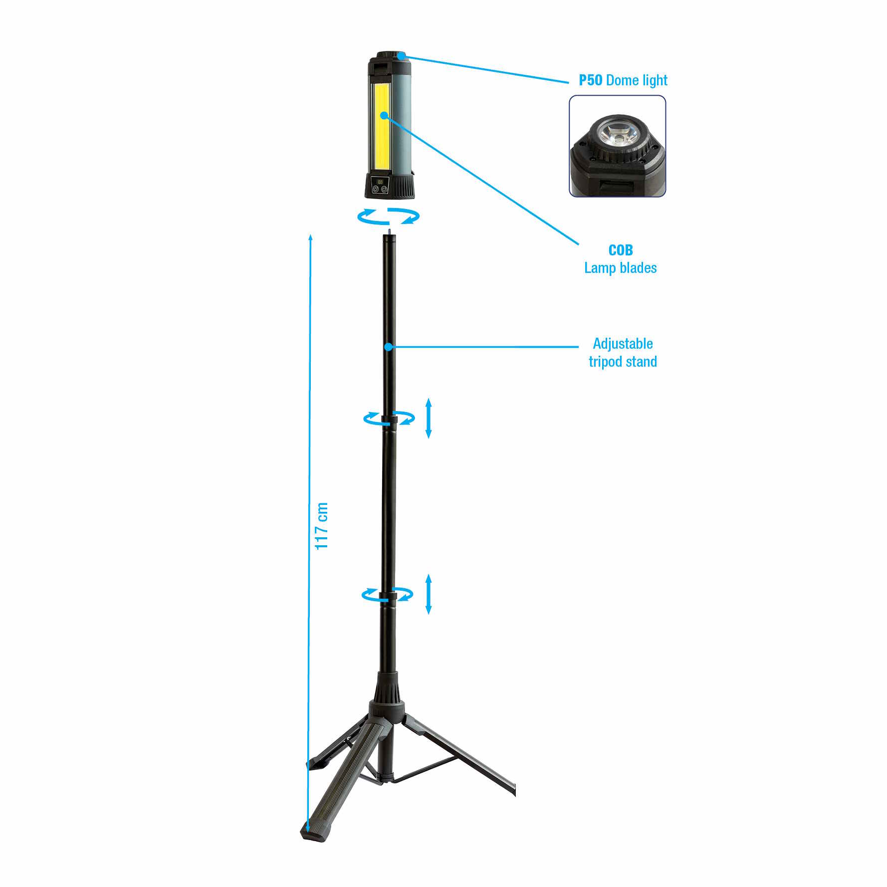 Teleskopski stalak omogućuje podizanje svjetiljke na veću visinu, što je iznimno praktično za građevinske radove, popravke vozila, rad u garaži, kampiranje ili bilo koji teren gdje je potrebna stabilna rasvjeta.
