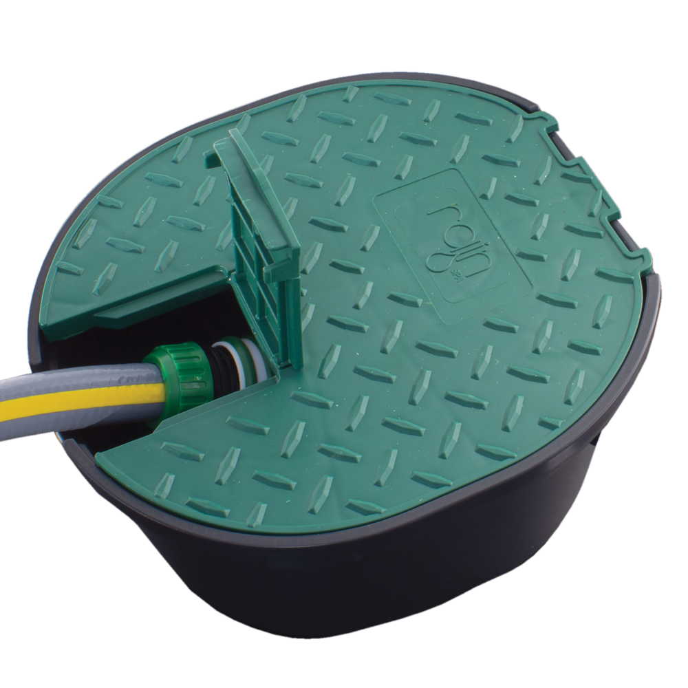 Dvostruki poklopac osigurava higijenu i praktičnost – može ostati djelomično zatvoren dok je cijev i dalje spojena, sprječavajući prodor zemlje i prljavštine. Gornji poklopac izrađen je od čvrstog PEHD materijala u zelenoj boji, dok je donje tijelo napravljeno od kvalitetnog polipropilena (PP), otporno na deformacije i vanjske uvjete.