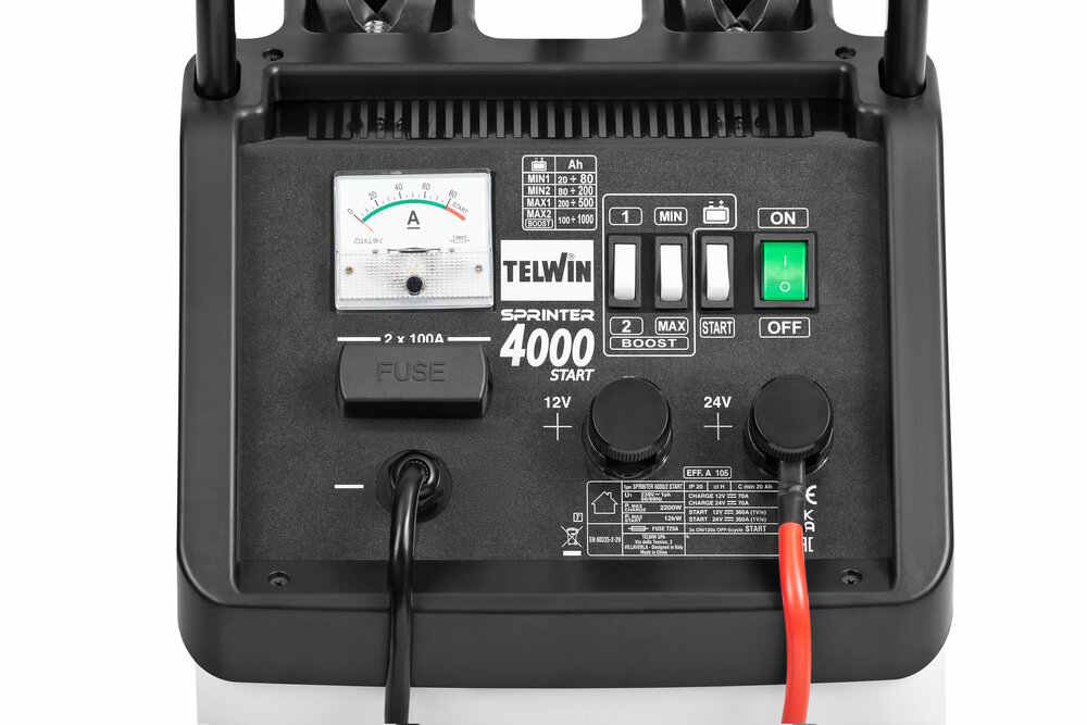 Telwin SPRINTER 4000 START – profesionalni punjač i start booster 12/24V, 400A, za aute, kombije i laka dostavna vozila. Velik kapacitet (20–1000 Ah) i sigurnosne zaštite. Dostupno na Vidam.hr.