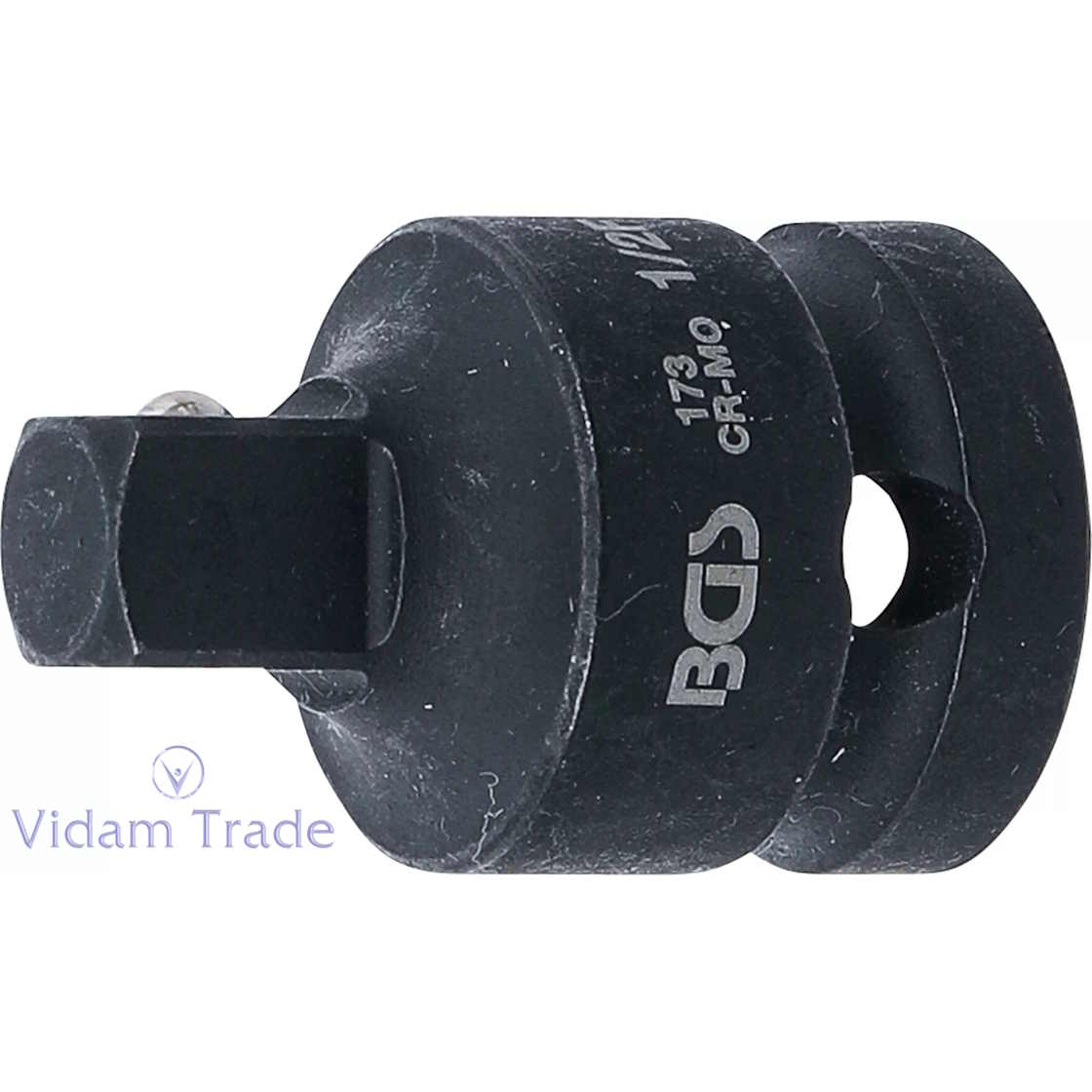 BGS udarni adapter (šifra 173) izrađen od kroma-molibden čelika. Omogućuje prijelaz s 1/2″ (12,5 mm) unutarnjeg kvadrata na 3/8″ (10 mm) vanjski kvadrat. Pogodan za ručne i udarne gedore, maksimalnog momenta do 230 Nm.